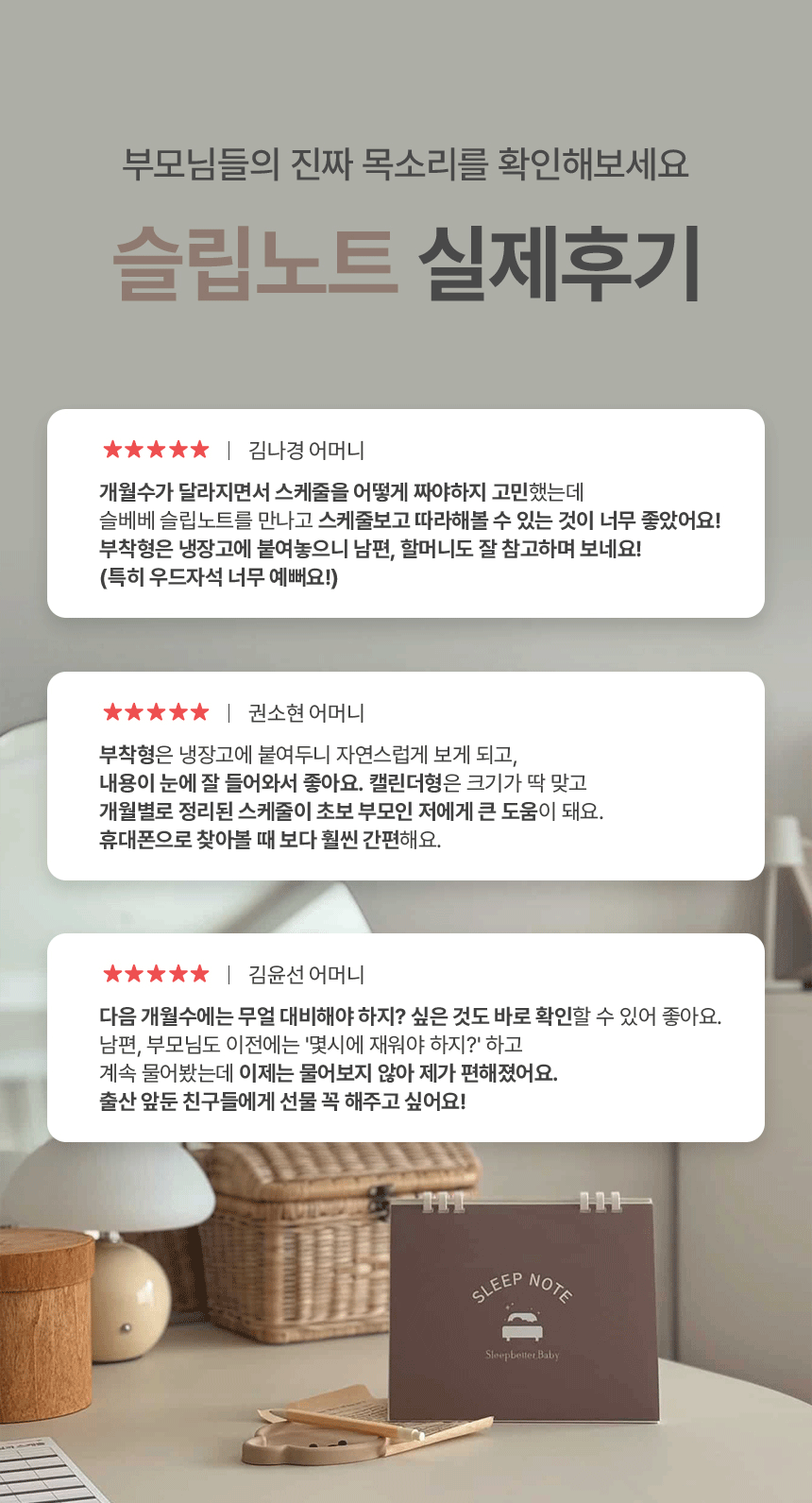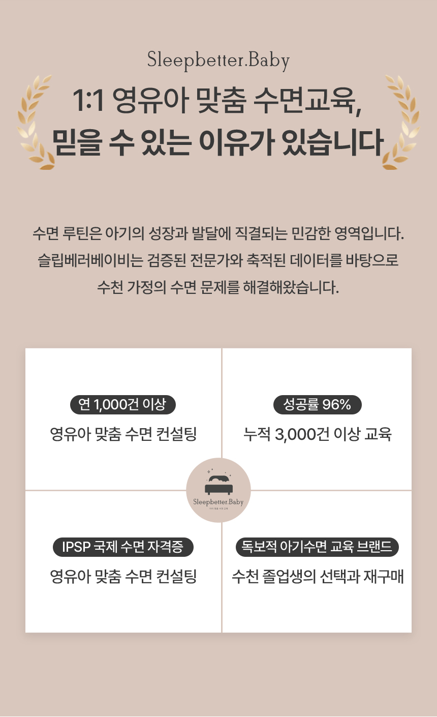 하지만 저는 부모님 곁에서 아이의 첫 교육인 수면교육을 성공으로 이끌어, 육아의 난이도를 낮추고 부모님께 더 큰 행복을 드릴 수 있도록 최선을 다할 것입니다.